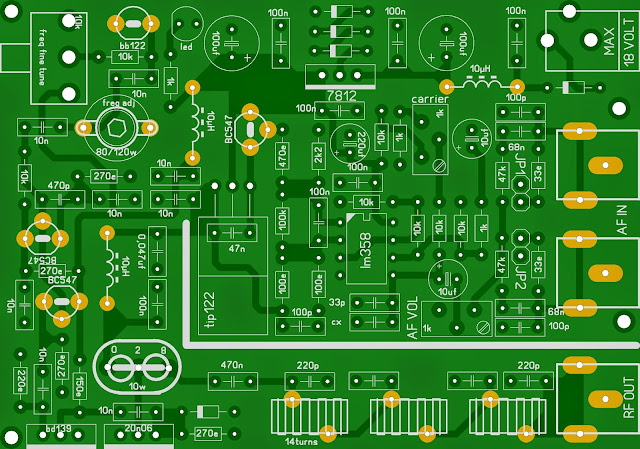 The layout of the 2SC1946 28 Watts FM broadcast RF amplifier has been created with sPRINT Layout v3.0. You can get a Shareware copy at: http://www.abacom.de. The pcb outline is 100 x 50 mm (width x height).